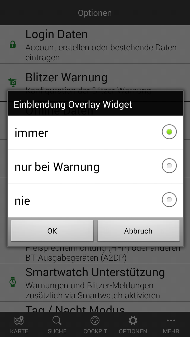 Der Hintergrundmodus kann durch das Widget erweitert werden und ermöglicht damit nicht nur eine akustische Warnung im Hintergrund, sondern auch eine kleine, transparente und verschiebbare visuelle Warnung vor Blitzern. Das Widget kann wahlweise immer oder nur bei einer Warnung angezeigt werden. Die Einstellungen sind in den Optionen unter Overlay Widget zu finden.
