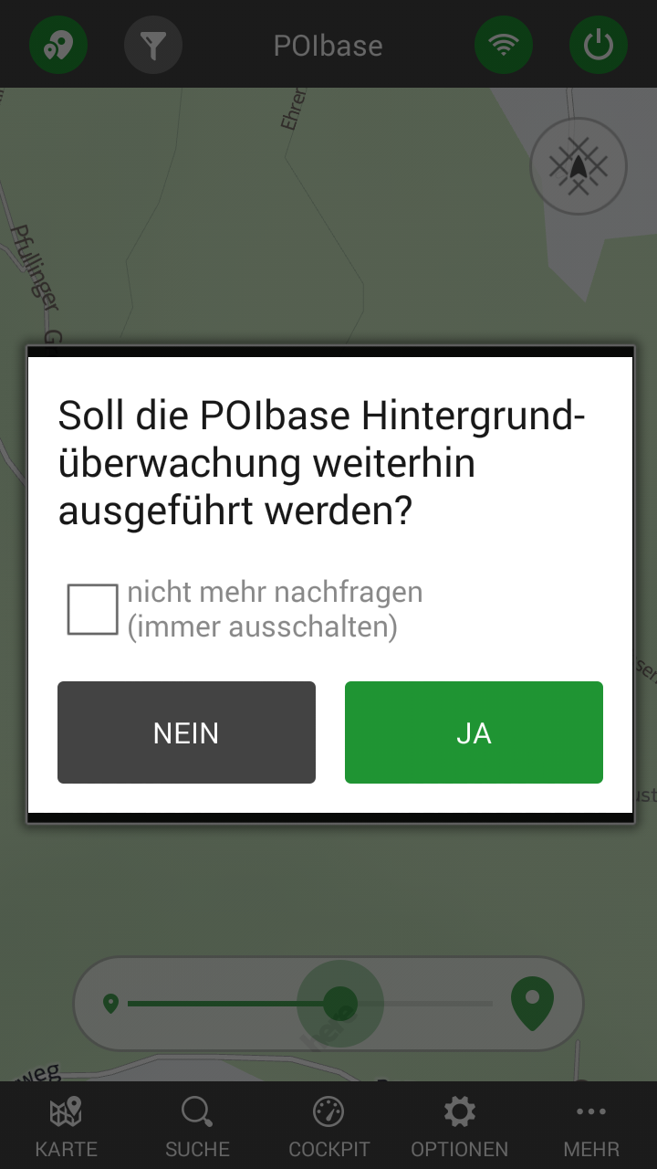 POIbase verfügt über eine automatische Offline-Erkennung für den Online-Modus. Wenn im Online-Modus während der Fahrt keine Internet-Verbindung mehr besteht zum Abruf der Blitzer, so wird automatisch in den Offline-Modus gewechselt. Sobald wieder eine Internet-Verbindung besteht, schaltet POIbase dann automatisch wieder in den Online-Modus. Voraussetzung für diese Funktion ist, dass die Offline-Blitzer bereits heruntergeladen wurden. Im expliziten Offline-Modus, d.h. wenn Sie den Offline-Modus per Knopf aktivieren, erfolgt natürlich kein automatischer Online/Offline-Wechsel sondern POIbase bleibt dann immer im Offline-Modus.