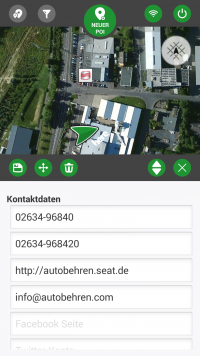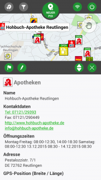 Die grün unterlegten Texte in der POI-Detail anzeige sind klickbar und führen die jeweilige Aktion aus: Telefonanruf, Browser, E-Mail.