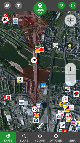 Über einen langen Klick auf eines der Kartensymbole wechselt die Kartenansicht in eine Satellitenansicht. Ein erneutes langes Klicken wechselt zurück in die normale Karte. Die Funktion steht in allen Kartenansichten zur Verfügung, also auch im Cockpit und in der Suche.