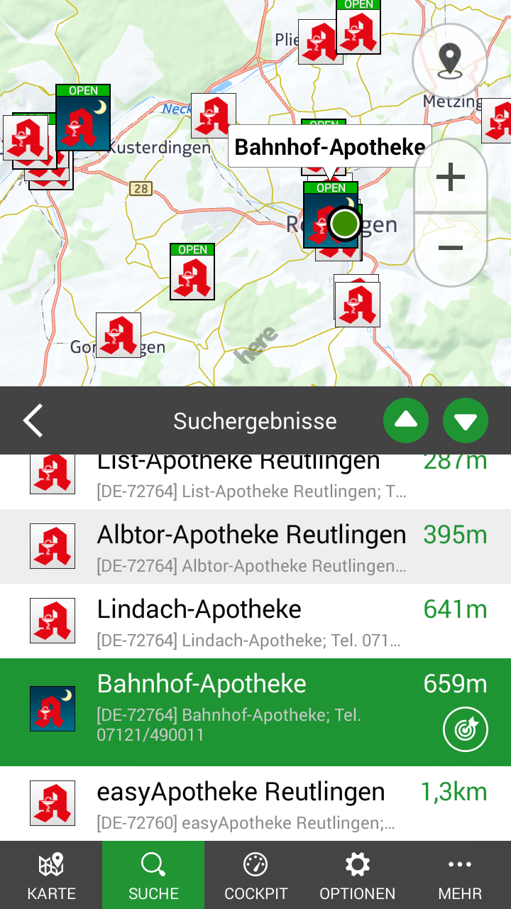 Zusätzlich sind alle Apotheken auch als normale POIs in der Karte und Suche verfügbar und können inkl. POI-Details abgerufen werden.