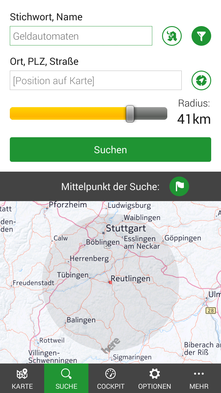 In diese Feld ein Ort oder Adresse eingegeben werden, welcher Mittelpunkt der Suche sein soll.