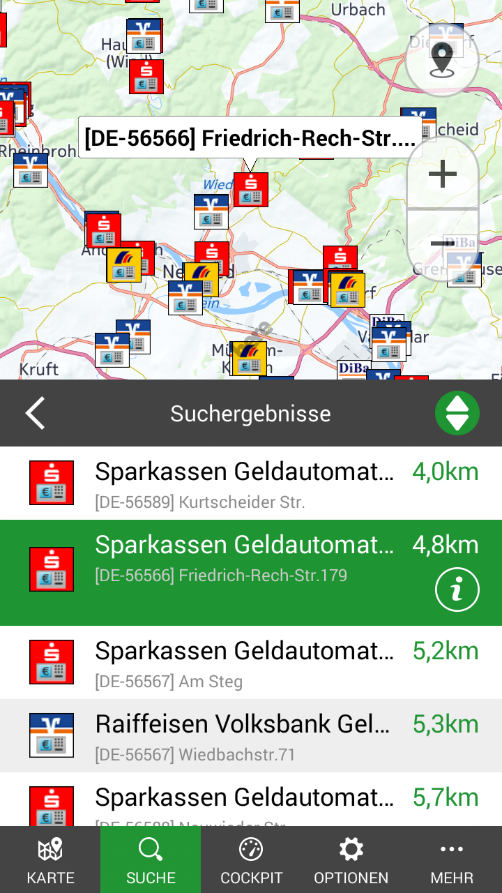 In der Suchergebnisliste ist der ausgewählte POI in der Karte markiert und in der Liste grün hinterlegt. Die Auswahl kann in der Liste oder in der Karte erfolgen.