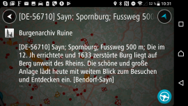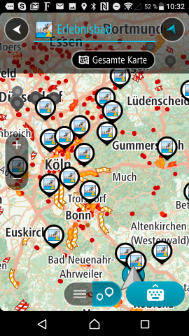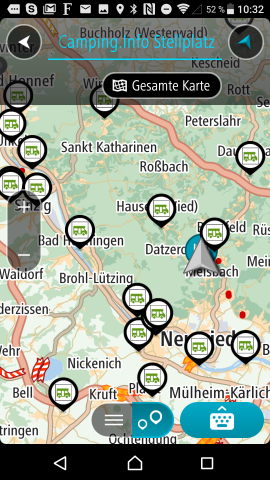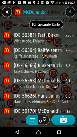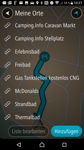 Mit Klick auf den gelben Button „POIs herunterladen“ unten rechts, werden alle ausgesuchten POIs in die Navi-App TomTom GO Mobile (Android) übertragen. Die POIs sind dann im Menü „Meine Orte“ in der App verfügbar.