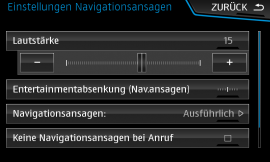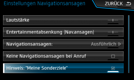 - Eine akustischer Annäherungsalarm kann unter „Navi“ „Setup“ „Navigationsansagen“ durch die Aktivierung des Menüpunkts „Hinweis: Meine Sonderziele“ eingestellt werden (nur für Fahrzeuge, die nach KW22/2015 produziert wurden = Modelljahr 2016). Die Lautstärke-Einstellung für die Ansagen beeinflusst auch die Lautstärke des Hinweistons.