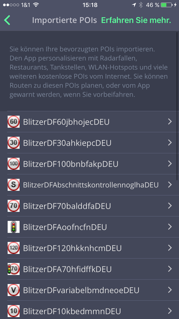 - Einstellungen für die POIs können in der Sygic App vorgenommen werden. Eine Warnung vor eigenen POIs ist nicht möglich.
