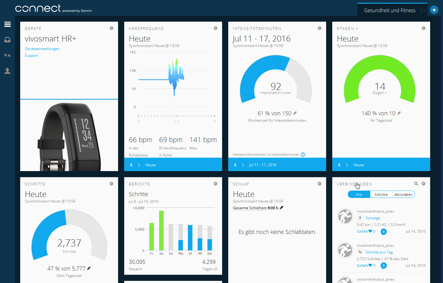 | Schlafanalyse: | tief, leicht, wach, HF, App, Garmin Connect |