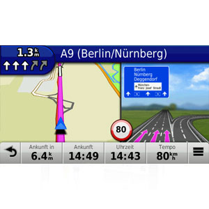 Nicht gefallen hat mir, dass die aktuell befahrene Straße nicht als Textzeile eingeblendet wird. Auf unbekannten Strecken können dann Verkehrsmeldungen im Radio nur schwer auf den eigenen Standort bezogen werden. Beim Navigon wird am unteren Bildrand immer der aktuelle Autobahnabschnitt, bzw. Straßenname eingeblendet. Dafür wird am oberen Bildschirmrand des Garmin immer die nächste Abfahrt/Autobahn/Straße angezeigt, auch wenn diese noch 100km entfernt ist.