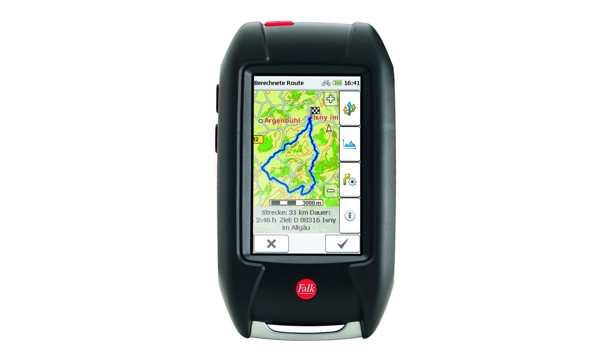 Mir ist vorrangig wichtig, dass mich das Gerät, soweit es möglich ist, von den Hauptverkehrsstraßen und dem Asphalt fernhält. Mit dem Falk Lux 32 in Kombination mit der Premium Outdoor Karte wurden meine Erwartungen als Mountainbiker absolut übertroffen. Allerdings sind die Maße und das Gewicht unter Berücksichtigung des höhen Kaufpreises nicht mehr zeitgemäß, so dass ich mir während dieser Testphase das Falk Pantera XC gekauft habe. Dieses Gerät besitzt ebenfalls die Premium Outdoor Karte, ist jedoch deutlich kompakter bei identischer Displaygröße und kostet knapp etwas mehr als die Hälfte vom Falk Lux 32.